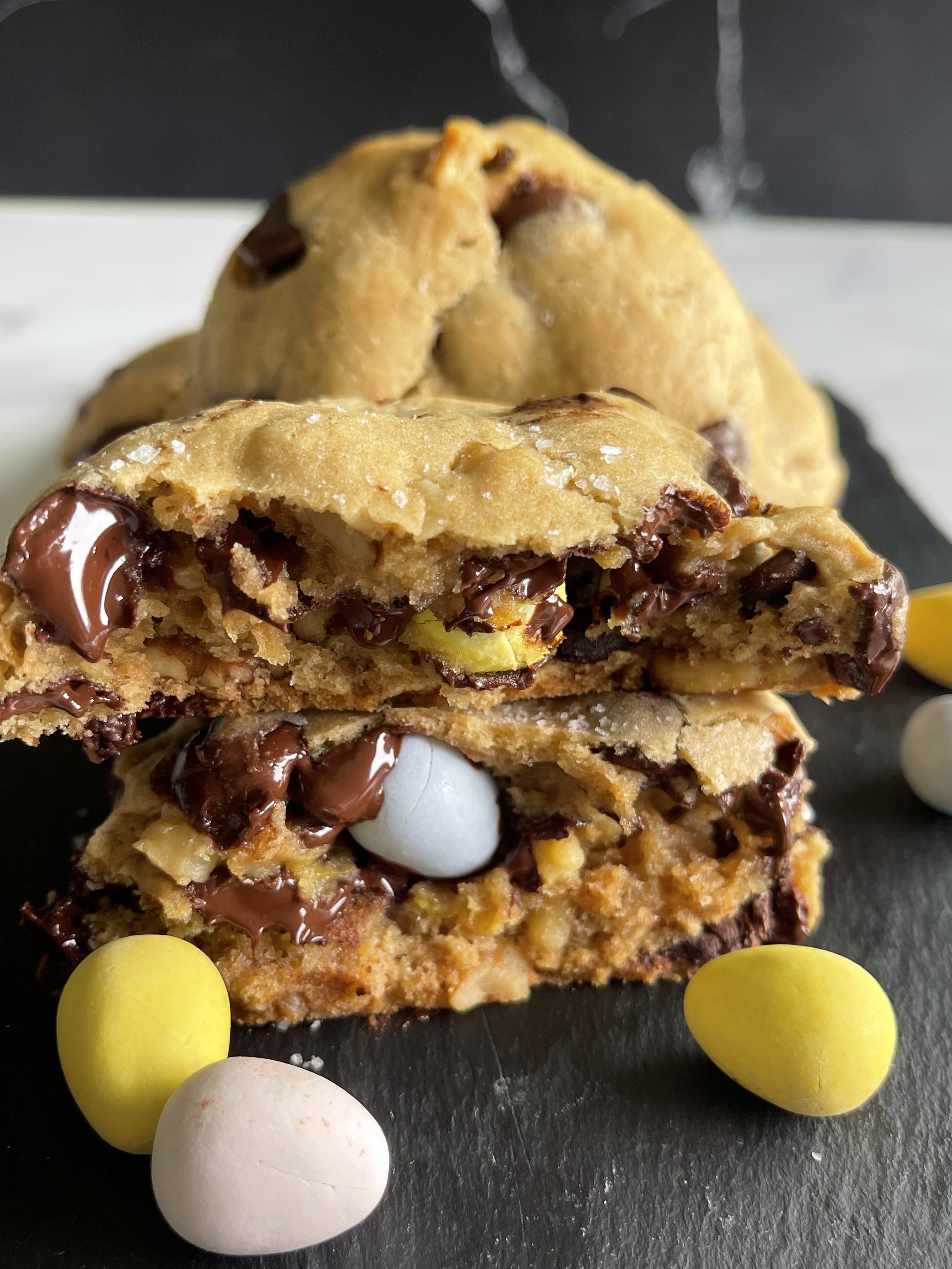 Walnut & Chocolate chonk cookie with hidden Cadbury milk chocolate egg inside with flaky sea salt sprinkle. NYC Levain style cookie with an Easter surprise.