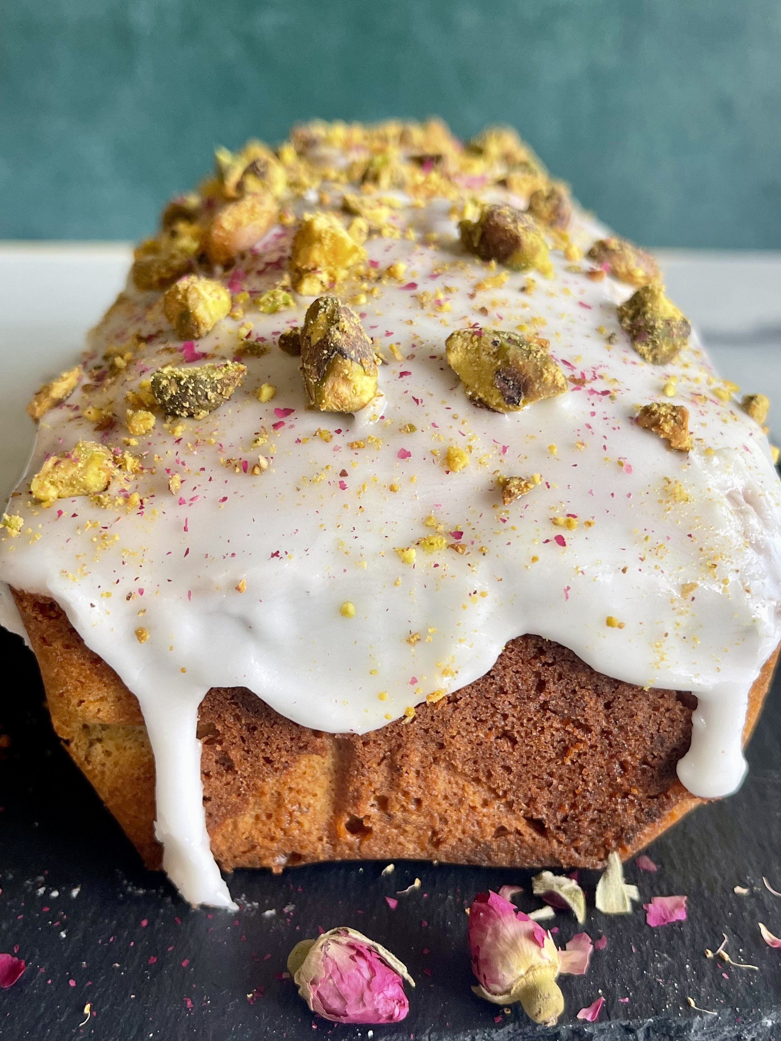 Pistachio Cardamom Loaf with lemon icing and topped with pistachios and dried rose dust. It’s a beautiful and delicious loaf that can be enjoyed all week or perfect as a hostess gift for your next party.