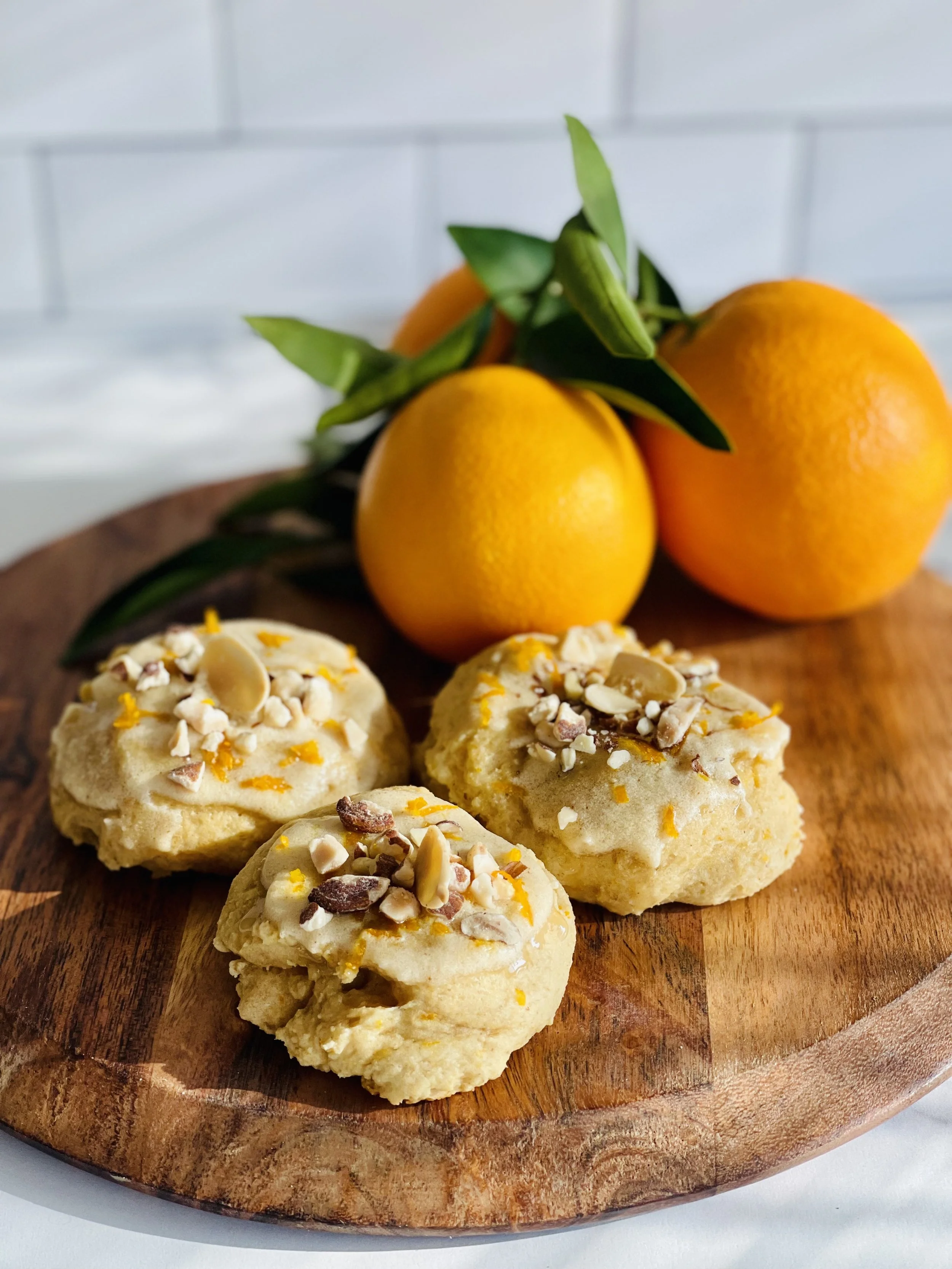 Sourdough culture is used to give the cookie a cake-like texture. We use high quality organic Sonora wheat and ferment cookie dough overnight. The overnight fermentation causes the taste to intensify creating a perfectly moist citrus crumb and crispy bottom. The brown butter glaze provides a caramelized nutty flavor accented by the toasted almonds and navel orange zest.